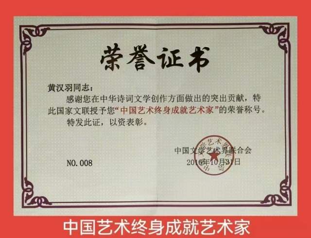 艺展与报道。黄汉羽文艺作品 弘扬了时代精神,树立了先锋榜 样。作品多次参加国內外展览, 包括 2016 年中俄朝艺术大家三人 行中国展 、2019 年中韩艺术名家 名品交流盛会﹙韩国东海市﹚、 2020 年曲阜孔子国学教育基地书 画名家作品展﹑ 2021 年梁家河民 间艺术展等。2017 年作品入选《向 十九大献礼·中国当代艺术大家黄 汉羽邮册》,入选 2017 年《中国 梦 • 艺术梦》官方贺岁台历。2016 年荣获北京翰墨艺评艺术研究院 “2016年年度书画艺术领军人物” 称号,荣获知名艺术评论家薛云年 书写艺评文章《艺术人生追求真 谛 . 事业造诣勇攀高峰——记当代 著名艺术大师黄汉羽》。2012 年 8 月在北京钓鱼台国宾馆召开的“第 三届共和国经济建设人物事迹报 告会暨企业经营与管理创新峰会”上,黄汉羽接受颁奖并应邀演讲。 2015 年 3 月 13 日《中国新闻》报报道了《园艺研究员黄汉羽的农艺 情怀》;2021 年 7 月国家级期刊《办 公室业务》封页上重点报导了 :“ 科技 + 文艺”先锋黄汉羽。2017年荣获“中共十九大题贺艺术名家”荣誉称号。2022 年春礼赞百年喜迎冬奥,中国新闻在线、文化艺术频道报道了“新时代艺术家黄汉羽”。 2022年喜迎 二十大,当代著名艺术家黄汉羽受邀刊登《人民代表报》, 报导了“新时代文艺先锋人物—— 黄汉羽”。2023年《市场信息报》专题报导了“黄汉羽:高境界诗歌圣手,新时代文艺先锋”。