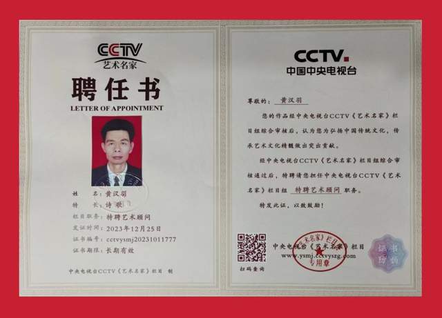 2023年入驻《中华名人词库》。2023年《中国经贸》报导了“新时代艺术家黄汉羽”。